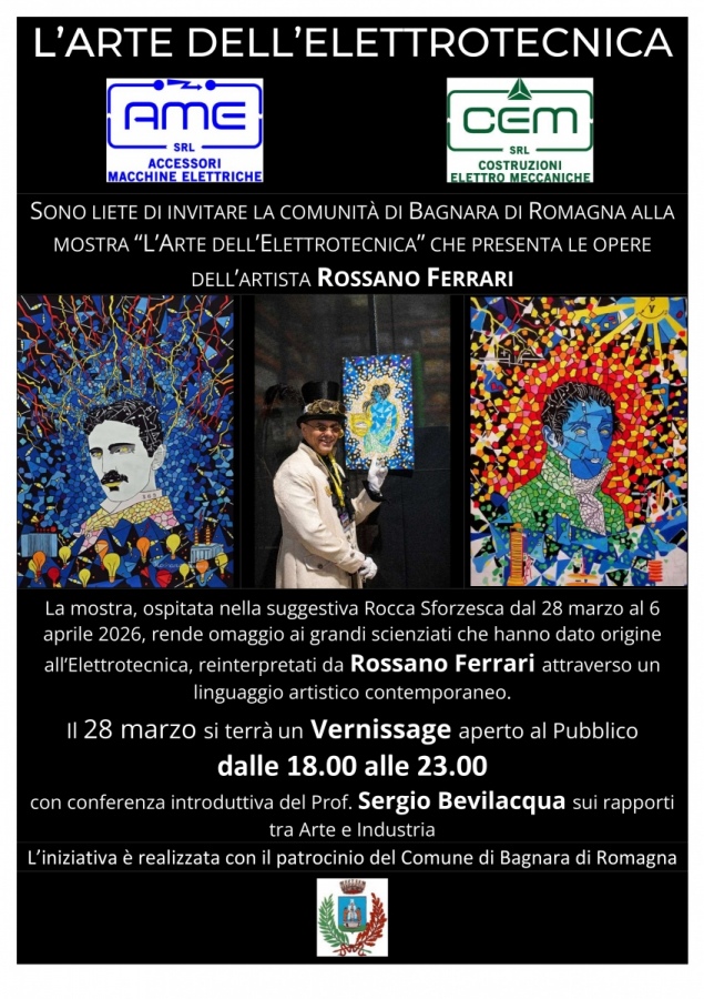 Si è svolta il 28 marzo 2026, presso la Rocca Sforzesca di Bagnara di Romagna, l’inaugurazione della mostra “Arte, valore identitario dell’impresa industriale. L’Arte dell’Elettrotecnica”, un evento che ha saputo unire in modo originale arte contemporanea, industria e tecnologia, offrendo alla comunità un’esperienza culturale di grande valore.