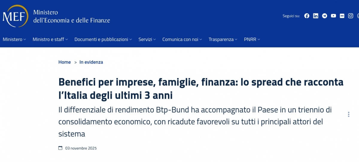 | Secondo il Mef, lo spread coi Bund tedeschi che aveva raggiunto i 251 punti base nel settembre 2022, ha toccato i 74 punti base a novembre 2025, mentre quello contro gli Oat francesi si è azzerato |